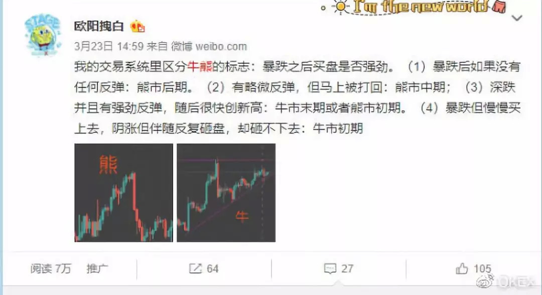 欧阳拽白:我平时周线、日线,小到5分钟都会做。我分仓位的,长线仓位做趋势,比特币是最适合做趋势的地方,不出现极端乐观行情不卖出。短线仓位来缓解手痒,大部分时候挣不到钱。