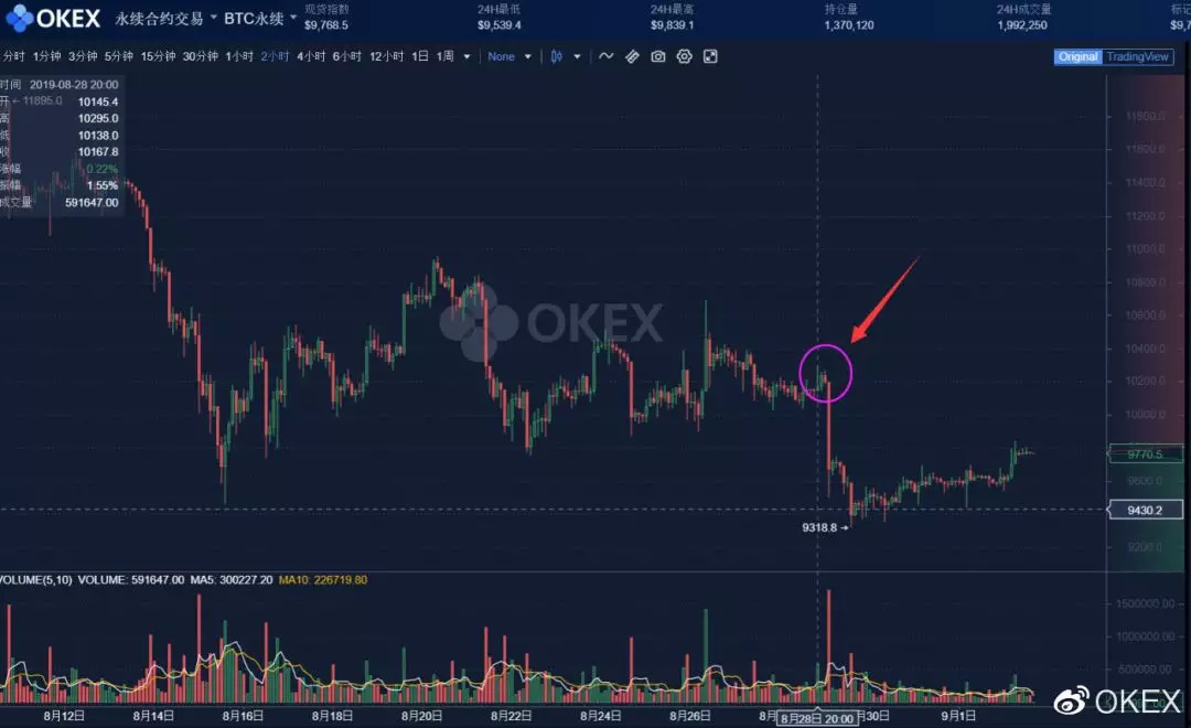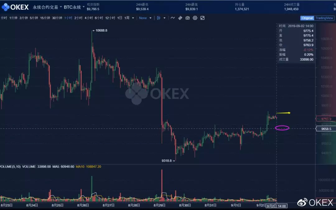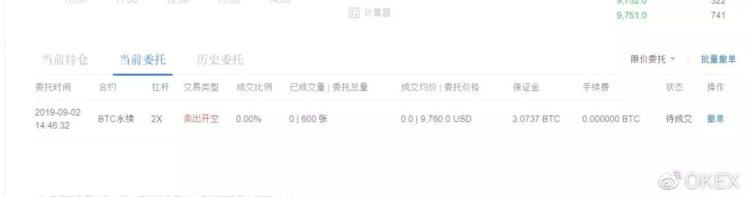上图为2019年9月2日14点的okex永续btc合约的图,此刻我看空btc有一波回调,于是我选择在此处开五成仓位(按照上文案例是600张、总仓位1倍)的永续空单,因此我在当前深度开仓如下图: