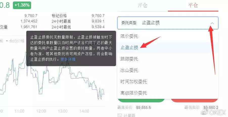 此刻仓位还未成交,但是我仍然可以在okex提前设计止盈止损。我的止盈点是9661,止损点是9801:
