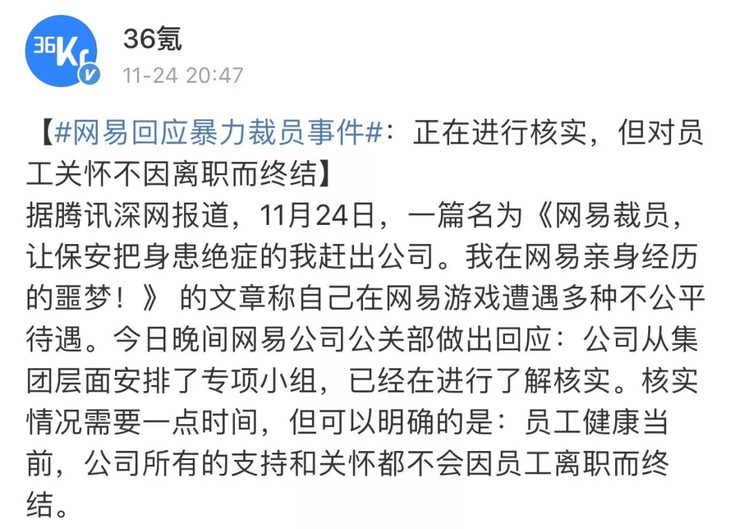 最近,一篇文章在朋友圈疯狂刷屏——《网易裁员,让保安把身患绝症的我赶出公司,我在网易亲身经历的噩梦》。