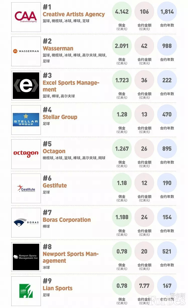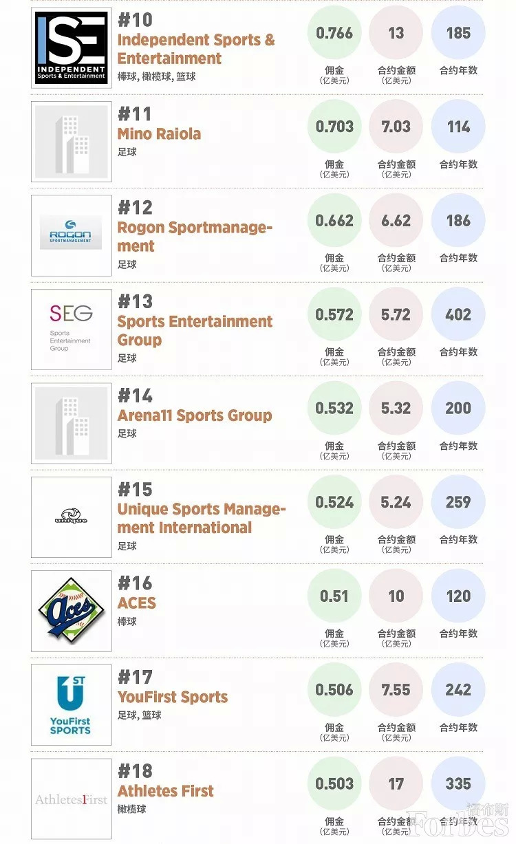 而在福布斯同期发布的2019全球最具价值的体育经纪机构中,三人的经纪公司也同样在榜单靠前的位置。巴内特的Stellar Group排名第4位,门德斯的Gestifute排在第6位,拉伊奥拉的Mino Raiola排在第11位。