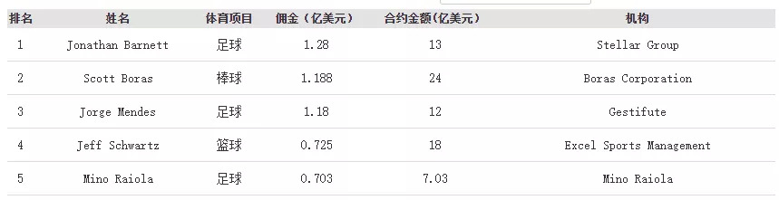根据福布斯今年发布的2019全球最有影响力体育经纪人榜单显示,排行前五的有三人都是足球经纪人,分别为:第一Jonathan Barnett(巴内特)、第三Jorge Mendes(门德斯)、第五Mino Raiola(拉伊奥拉),而他们的佣金分别达到了1.28亿美元、1.18亿美元、0.703亿美元。