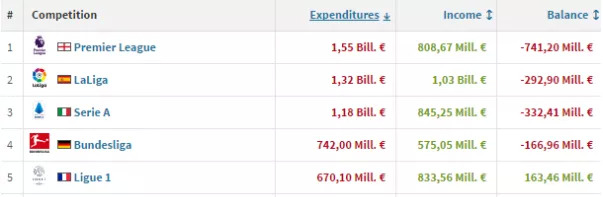 不过显然,这只是目前的设想。2020转会冬窗期即将到来,而对于各项的新规还没有明确表示。今年夏季转会期,英超投入了15.5亿欧元、西甲投入13.2亿欧、意甲投入11.8亿欧,德甲和法甲分别投入7.42亿欧和6.7亿欧,五大联赛占据了榜单前五位。