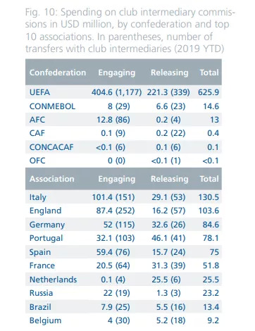 2019足坛中介佣金6.35亿美元,欧洲俱乐部占95.7%