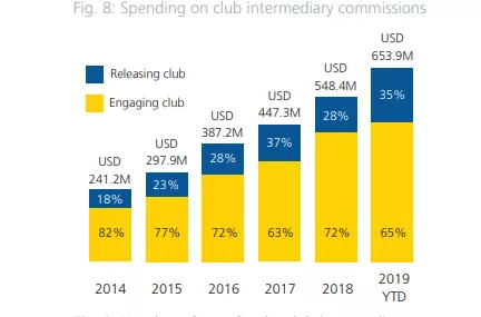 近日,国际足联在官网官方公布了2019年足坛转会中介评估报告。报告显示,2019全年转会市场中花费的中介佣金创纪录的高达6.539亿美元。