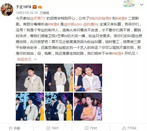 产量高也很少压剧的于正,自然有想捧谁就捧谁的底气。但群众也有逆反心理,你越捧她我越要踩。欢娱旗下大小爆剧不断,却很难出一个真正的流量明星,与他时不时为了艺人开麦的爱好密不可分。