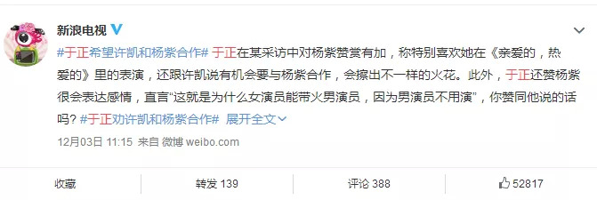 爆款制造机于正,畅想杨紫与自家艺人许凯合作,被群众质疑强调杨紫“旺夫”是暗踩李现。随后有粉丝群截图流出,面对许凯粉丝“求放过”的小作文,于正以一句“有多远滚多远”作为回应。