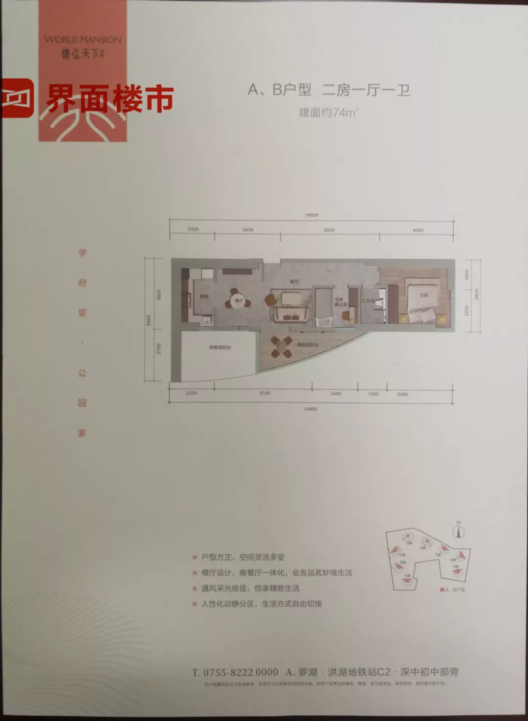 74平方米两房的户型为长方形,最为“特别”。西北朝向,采光很好,景观也不错,看洪湖公园和银湖山景,不过下午会西晒。