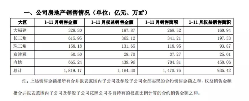 1-11月份,阳光城累计销售额为1819.17亿元,较上年同期增加488.3亿元,同比增加36.69%。
