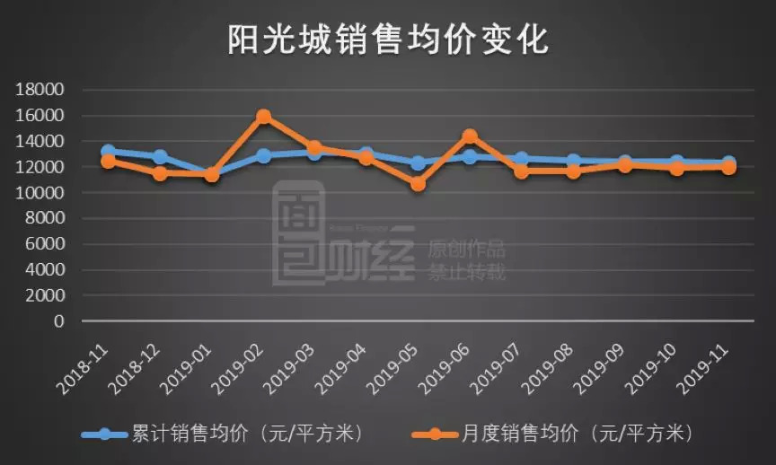 根据累计销售面积及销售额计算,1-11月份阳光城累计销售均价为12368.91元/平方米,环比上月波动在0.5%以内,保持稳定。