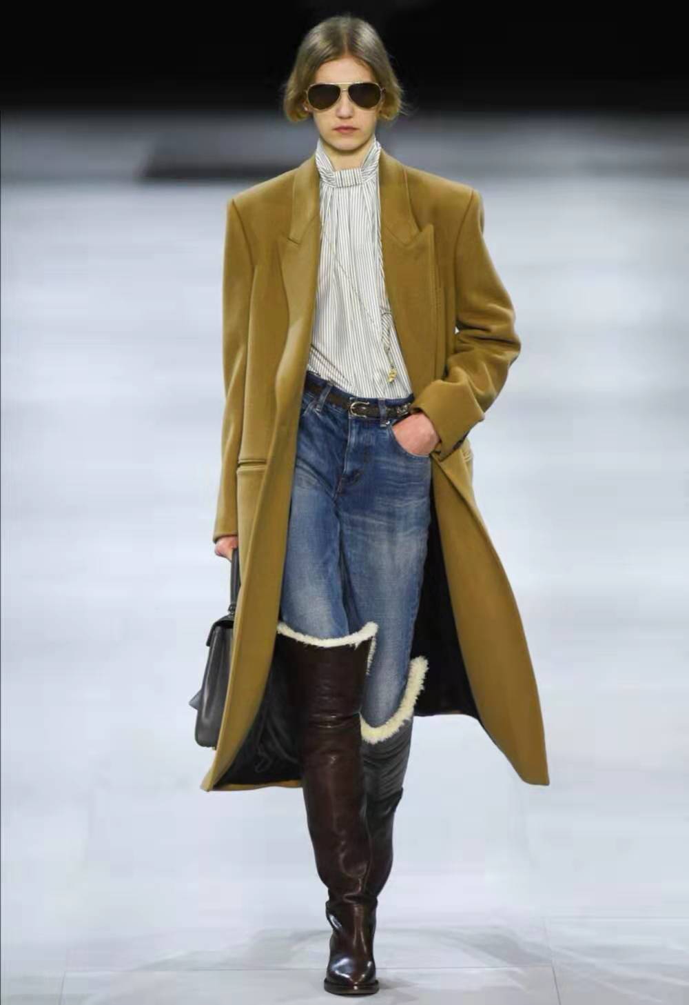 界面时尚查阅小红书发现,和几年前一样,大部分人依然钟爱“下半身消失”穿搭法。由于羊羔毛外套较宽大,下半身穿短裙或连裤袜露出长腿,也能减缓臃肿感。“上松下紧”的法则同样适用,简单的紧身牛仔裤和长靴就能搞定。