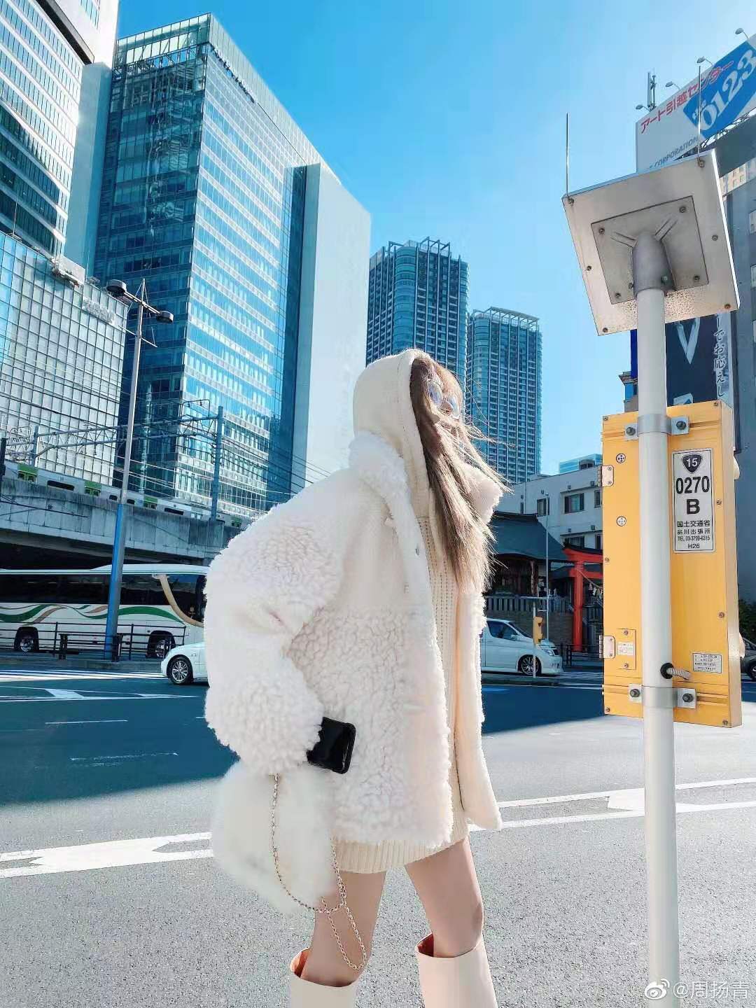 如果不想穿显胖的羊羔毛外套,选择一个今年爆火的帽子、包袋或鞋的羊羔毛单品,也能给整体造型增加可爱和温暖感。