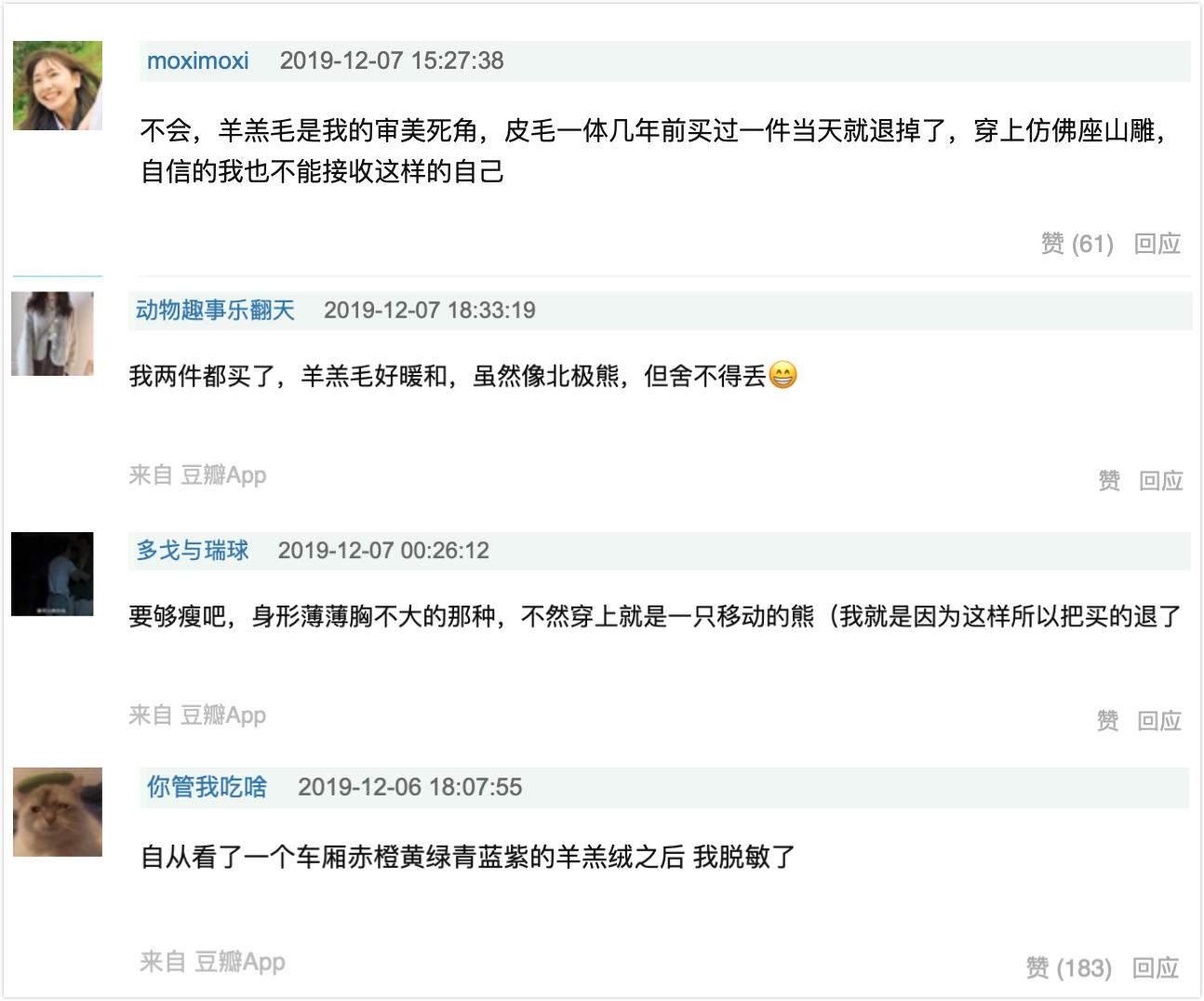 豆瓣关于羊羔毛的讨论贴中吐槽的人不少。“个子低的我穿上羊羔毛就像山大王”、“穿白色,你就是白熊;穿黑色,你就是黑熊;穿棕色,你就是棕熊”……但这都不能阻挡他们对羊羔毛的渴望,一边抱怨一边求链接。