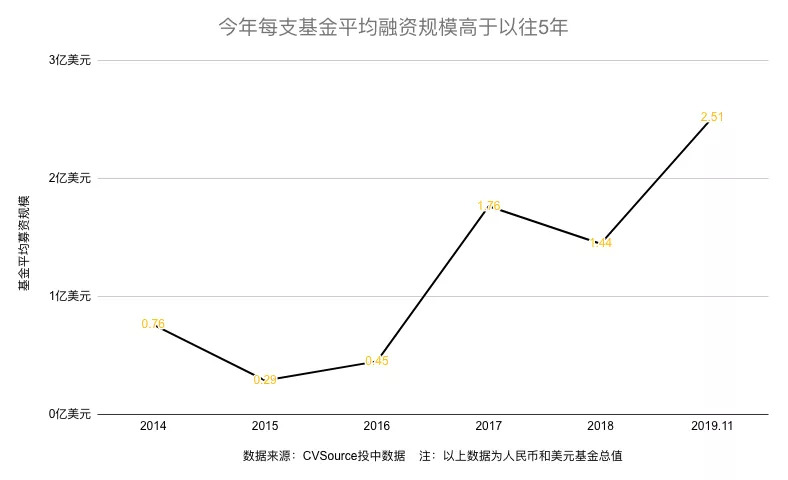 今年基金数量虽少,但前11个月规模几乎与去年持平CVSource投中数据显示,今年前11个月共有480支基金人民币与美元基金共募得1206.62亿美元,与2018年862支基金募资的1244.99亿美元几乎持平。平均下来,每支基金平均募资2.51亿美元,高于过去5年的平均水平。