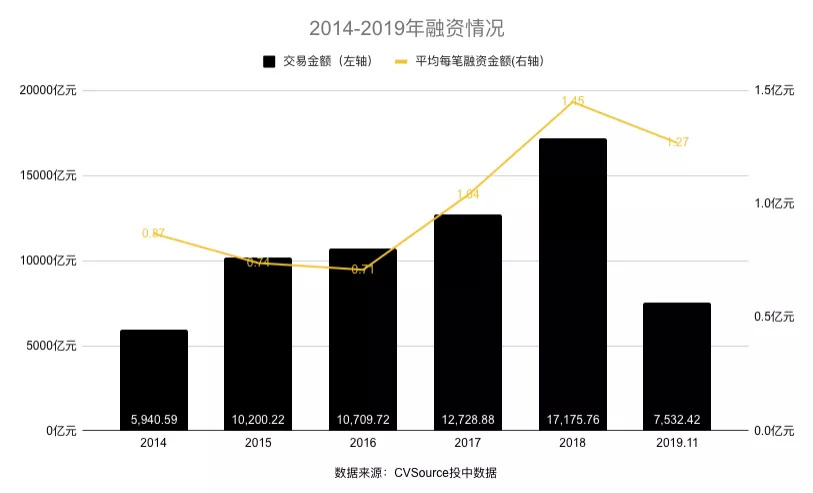 CVSource投中数据显示,今年投融资的确规模减少了,但平均下来单笔投资并不没有减少。具体来看,2019年平均每笔融资达1.27亿元,为2014年以来第二高——低于2018年的1.45亿元。