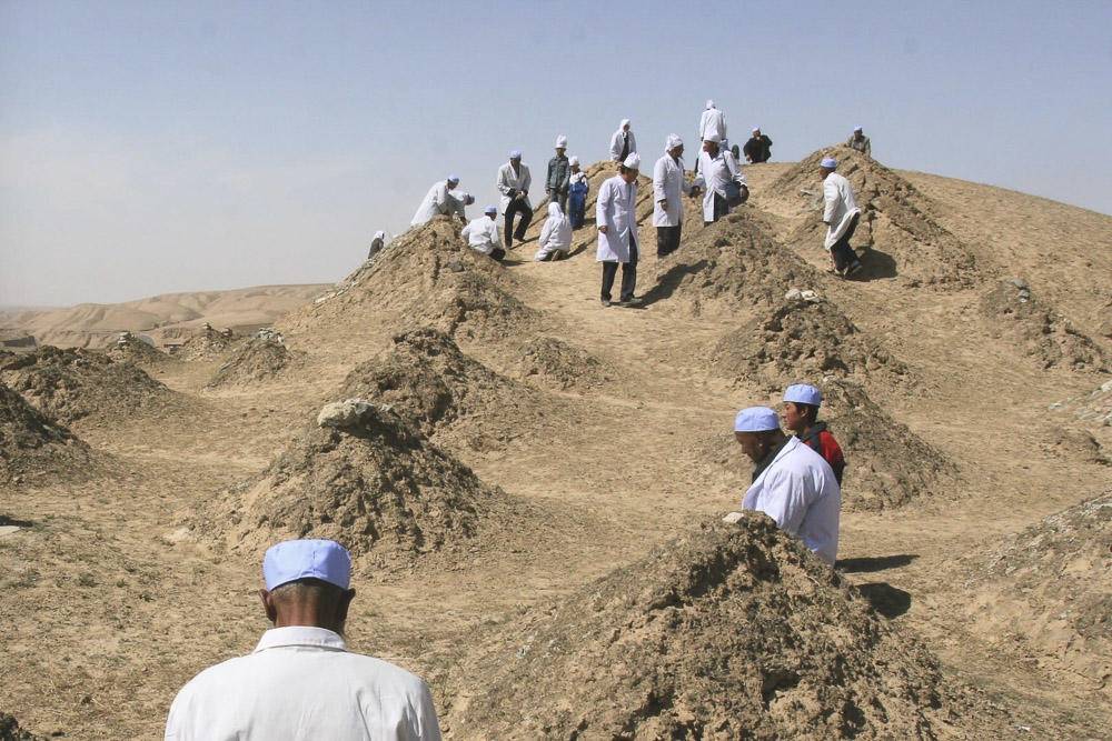 上坟的人们。穆斯林上坟形式很简单,没有祭品,只是念诵《古兰经》中的特定章节,表达对造物主的敬畏,对亡人的追思缅怀。2007年, 宁夏海原县
