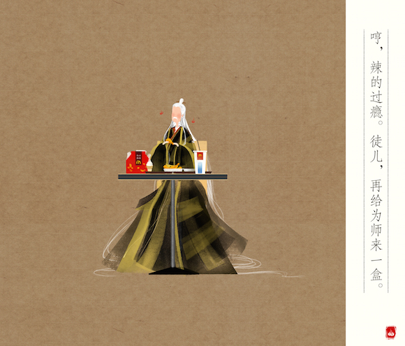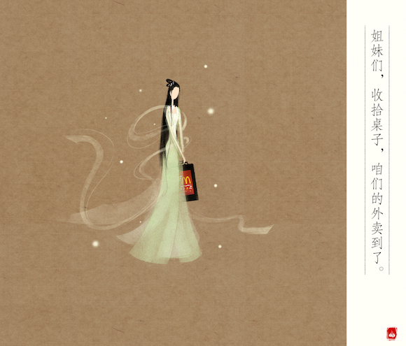 所以你可以看到在这组麦当劳中国风海报中:七仙女招呼着姐妹们来吃外卖、太上老君被麦辣鸡块辣的直呼过瘾、玉皇大帝贴心地问小仙童“薯条喜欢蘸番茄酱还是甜酸酱?”漫画家通过这种人物与对话之间的鲜明反差,为麦当劳本身的形象增添了许多趣味。