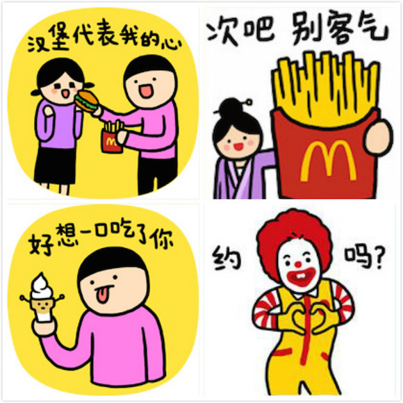比如今年年初与“贱萌风”表情经典代表的表情设计师小崽子合作,推出了一幅名为“如果古代有麦当劳”的搞笑漫画和11个同系列表情符号,可以供消费者在微信聊天时使用。