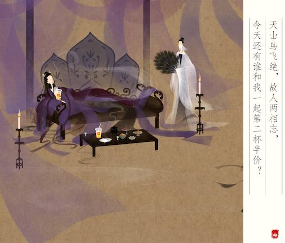 这组脑洞大开的海报由画手王晓艺(@呼葱觅蒜)制作,此前她曾凭借一组现代中国风的“青蛇漫画”在微博上获得了不少关注,擅长画作“无脸古装群像”的她喜欢将传统故事中的人物赋予新的角色性格,而在这组中国风海报之后,王晓艺还将为麦咖啡新上市的大吉岭奶茶设计全新的古风人物。