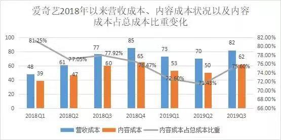 根据近几个季度的财报观察显示,爱奇艺的内容成本占总营收成本的比重略有下降;但从2018Q1财报发布以来的数据来看,内容成本占总营收成本的比重仍在70%以上,说明爱奇艺的内容成本是营收成本的大头。