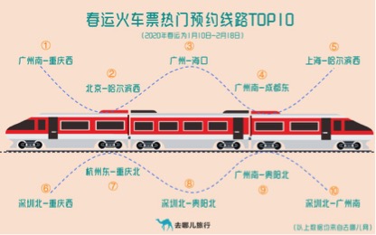根据去哪儿平台提供的火车票预约数据,2020年春运期间最热的三条线路依次是广州南-重庆西、北京-哈尔滨西和广州-海口;广州南站、北京西站和广州站将成为春运期间出发旅客最多的三个车站;哈尔滨西站、重庆北站及成都东站则成为旅客到达量最多的三个车站。