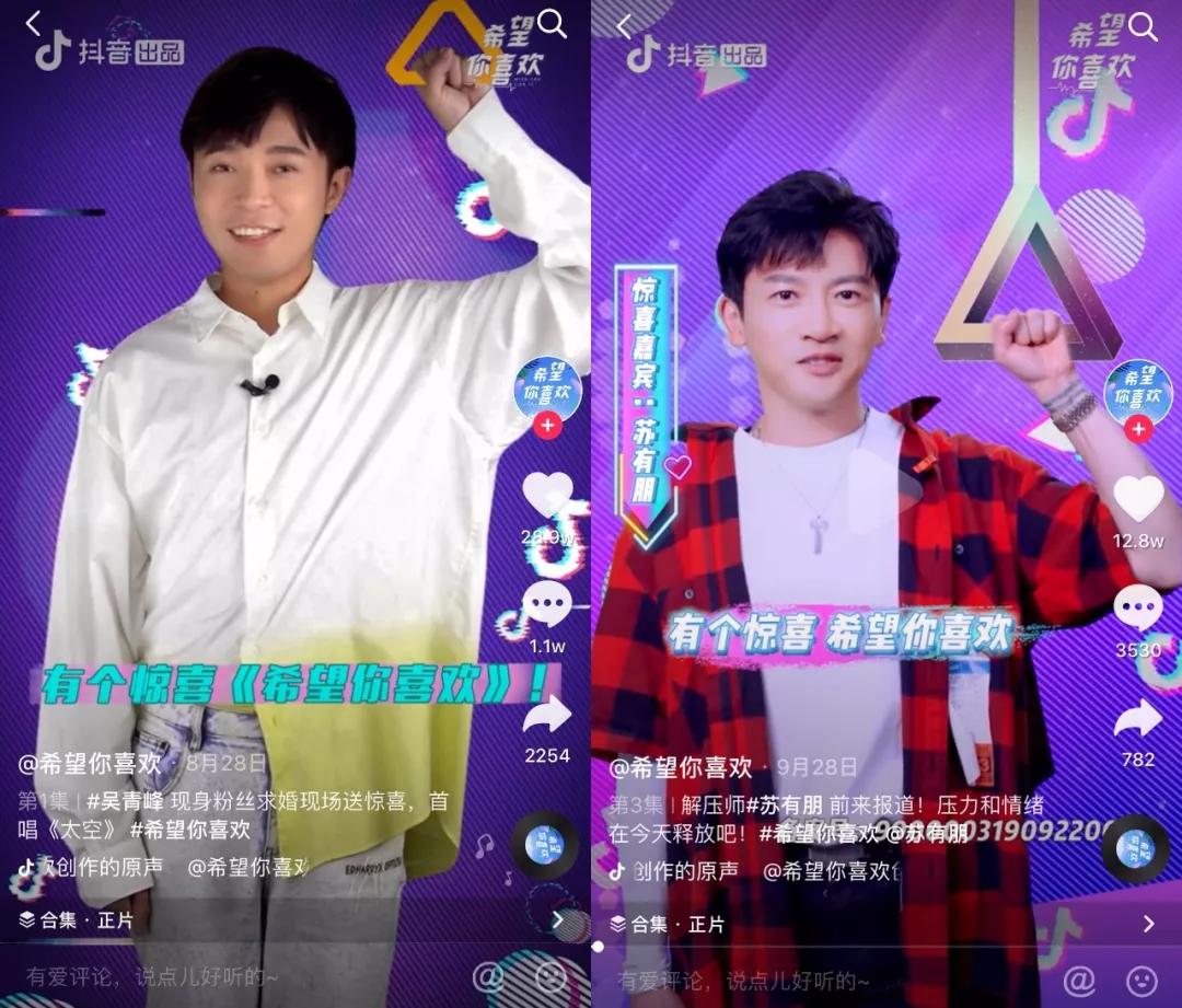 而针对国民认可度更高、知名度更广的大众明星,抖音则有相对应的竖屏综艺《希望你喜欢》,节目设定是让具备一定粉丝数量的歌手,如吴青峰、苏有朋等,通过在不同场合下来给粉丝制造惊喜,比如为粉丝求婚现场送祝福、化身人生导师抚慰粉丝素人,也像一个爱豆福利回馈现场。