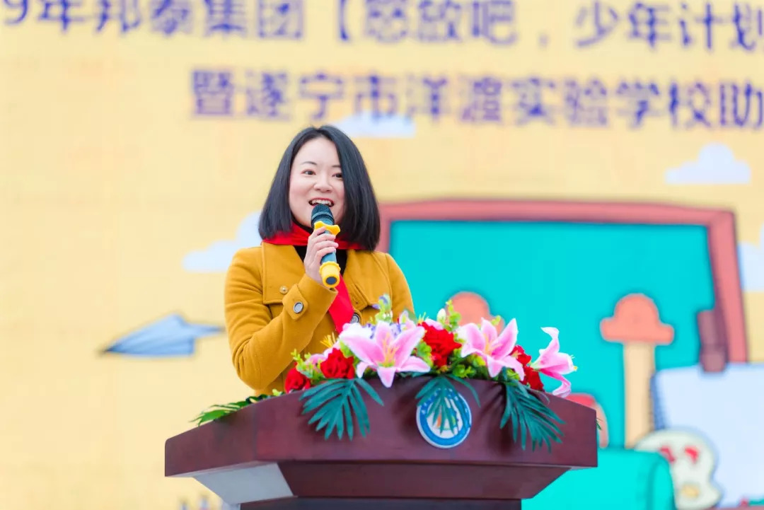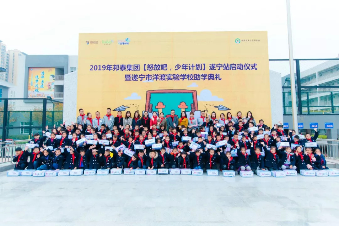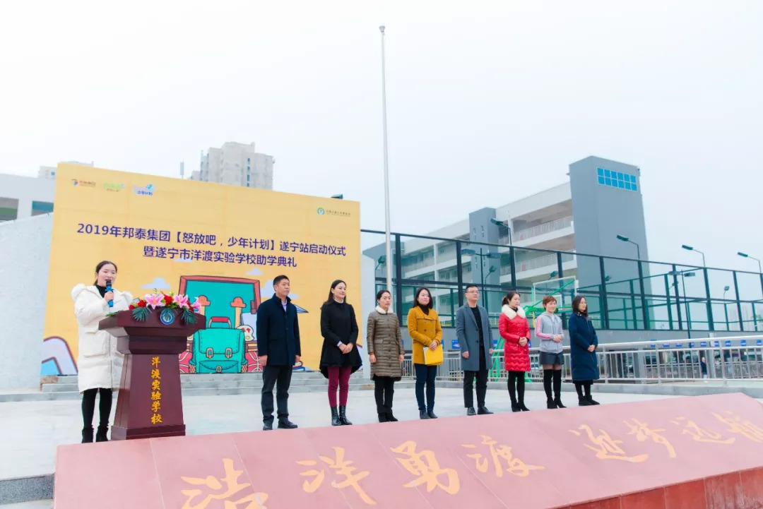 12月11日上午,2019年邦泰集团【怒放吧,少年计划】遂宁站启动仪式暨遂宁市洋渡实验学校助学典礼隆重举行。遂宁市河东新区党工委副书记杨明先生、遂宁市妇联副主席张玲女士、遂宁市政府妇儿办主任蒋红梅女士、遂宁市河东新区妇联主席赵文贤女士、遂宁市河东新区教育工作领导小组办公室主任曾义华女士、遂宁市洋渡实验学校师生、遂宁公司及集团品牌板块员工、邦泰爱心志愿者、遂宁各大媒体共同见证了这一美好抵达的温暖时刻。