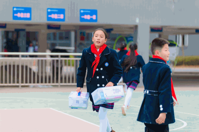 ▲孩子们也加入到搬运爱心礼包的队伍中来