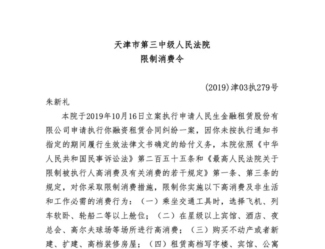 天津市第三中级人民法院近日公布的消息显示,在与民生金融租赁股份有限公司的融资租赁合同纠纷一案中,因未在指定的期间履行生效法律文书确定的给付义务,朱新礼被列为失信被执行人,收到限制消费令。