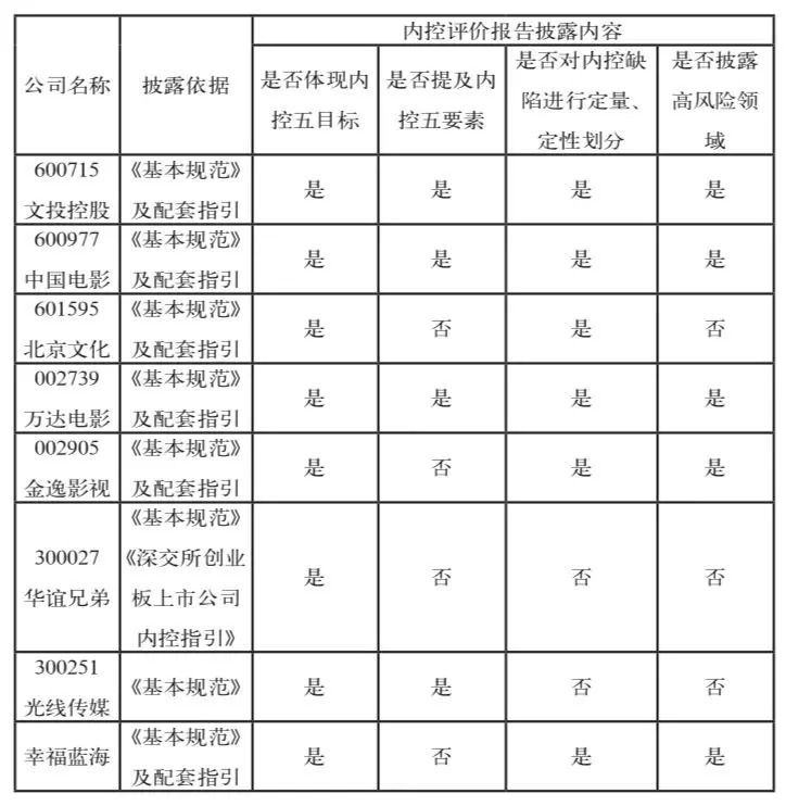 有电影公司会详实的披露五要素的内部控制信息,比如中国电影和文投控股。有电影公司会参照五要素,然后结合自己的公司制度来进行披露,比如万达电影和光线传媒。也有公司不会参照五要素,仅仅在提及五要素后只按照自己的公司制度来披露,比如金逸影视。也有公司不参照五要素,也没有自己的制度,只是披露信息,比如华谊兄弟、北京文化、幸福蓝海。