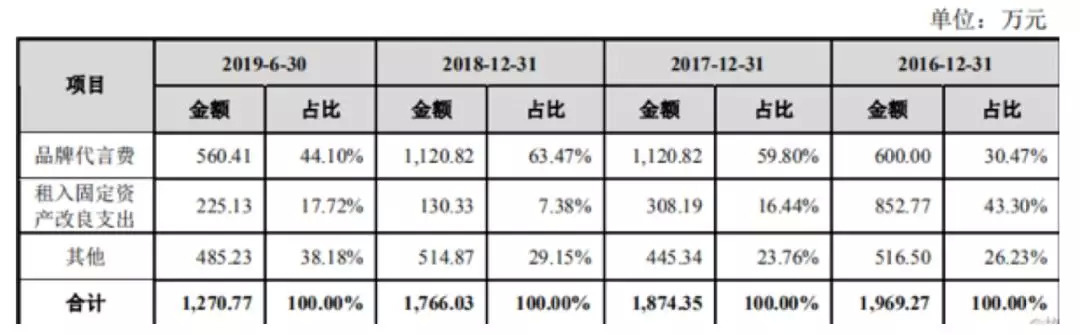 此外,在公司的长期待摊费用构成情况中,品牌代言费占较大比例。2016年为600万元,2017年、2018年增长至1120.8万元,2019年上半年也有560.41万元。