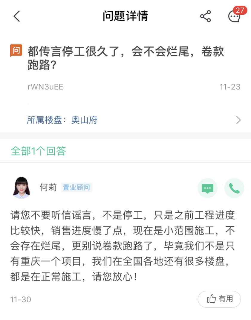 界面重庆在安居客网站上也看到奥山府项目置业顾问对网友“项目停工”质疑的回应,置业顾问表示:“请你不要听信谣言,不是停工,只是之前工程进度有点快,销售进度慢了点,现在是小范围施工,不会存在烂尾。”