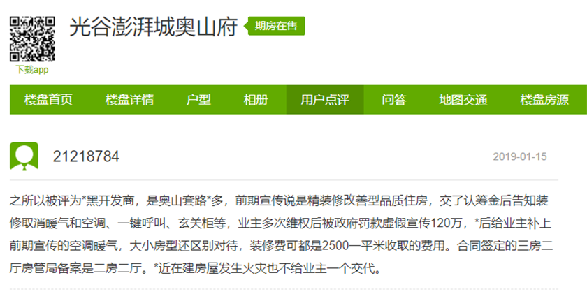 据武汉热线房产网2018年报道,奥山地产在武汉打造的“光谷澎湃城奥山府”项目,曾遭到业主的多次维权。据业主反映,该项目在前期进行了虚假宣传,并陡降装修标准。后来项目开发商公开发文致歉,表示将针对问题进行调整,并于8月26日前修改重发给工商部门审核。