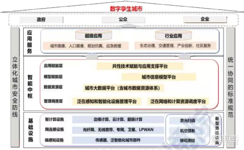 ▲中国信通院《2019数字孪生城市白皮书》:数字孪生城市总体架构