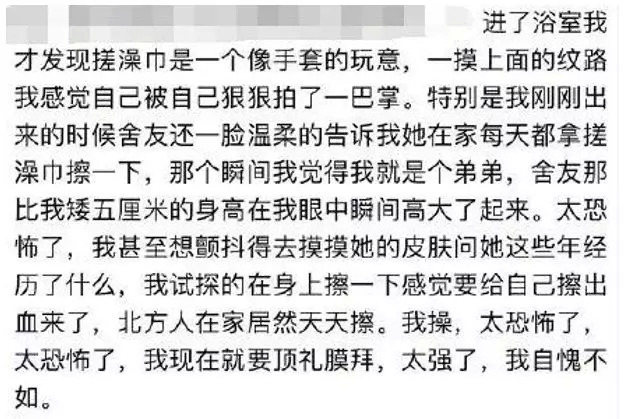 南方同学初见搓澡巾,要么一脸嫌弃,要么如临大敌,但归根结底,也逃不过一句“真香”。