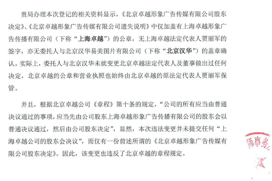 界面新闻记者获得了一份北京卓越形象的诉讼材料称:2018年12月,视觉中国全资子公司北京汉华捏造了北京卓越形象广告的股东决议,并谎称子公司的营业执照和公章遗失,最后将子公司的法定代表人进行更改。