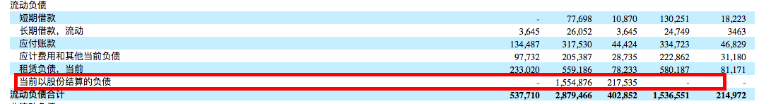 不过,从披露的招股书看,这笔融资极有可能是一笔“明股实债”的融资。2018年的流动负债项目下“当前以股份结算的负债”显示,优客工场有2.17亿美元的借款。通常来说,流动负债指一年内需要偿还的债务。优客工场在这个时点选择赴美上市,或许也与这笔明股实债的融资相关。