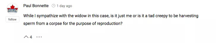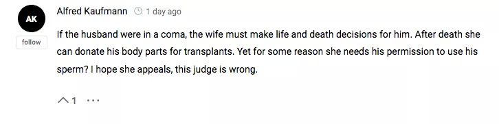 但也有网友称,死者的妻子应该继续上诉,因为法院也太无情了:“如果丈夫处于昏迷状态,妻子则必须为他做生死抉择。丈夫死后妻子可以捐献他的身体器官进行移植。但出于某种原因,妻子需要丈夫的许可才能使用他的精子?这位妻子应该上诉,因为法官作出了错误的裁决。”