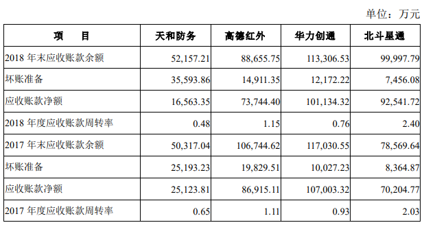 在上述回复函的会计师意见中,相比同行业公司高德红外(002414.SZ)、华力创通(300045.SZ)、北斗星通(002151.SZ),天和防务2017至2018年超50%的坏账准备远高于同行,应收账款周转率远低于行业平均水平。