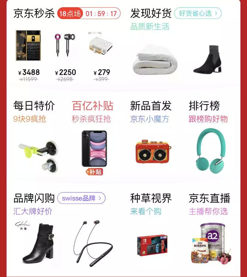 京东APP现有京东秒杀、每日特价、品牌闪购等三个频道,三个频道相互打通并加入了百亿补贴,形成京东秒杀营销平台。