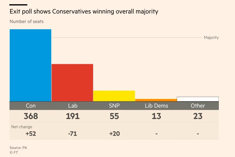 根据民调,这是保守党1987年以来在大选中获得的最大胜利。而工党则比两年前的大选少了71个席位,是该党1935年以来最惨重的一场挫败。