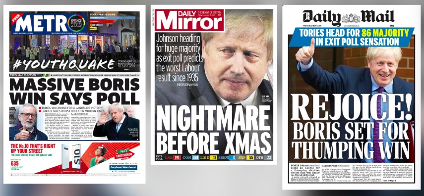 英国各大媒体在13日的头版头条中都刊登了约翰逊在出口民调中获胜的消息,但表现出的情绪却不尽相同。《每日邮报》在封面上打出了“庆祝!”的字眼,《镜报》却称这是圣诞节前的“噩梦”。