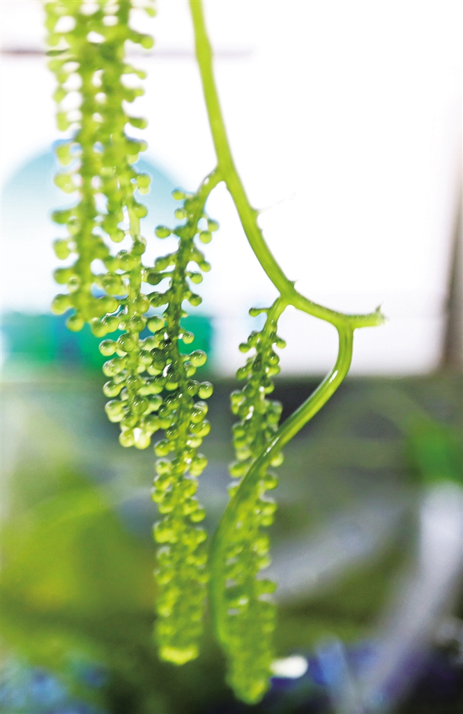 “这一串串绿色的颗粒是什么?”在文昌馆内,不少观展者围在一处水缸前发问。工作人员告诉南国都市报,这种植物名为“海葡萄”,学名长茎葡萄蕨藻,属绿藻类,因外观浑圆饱满、如一串串晶莹剔透的葡萄而得名。而这些美丽的绿色小颗粒散发出海味的咸鲜芳香,颇有鱼子酱的神韵,所以被喻为植物中的“绿色鱼子酱”。