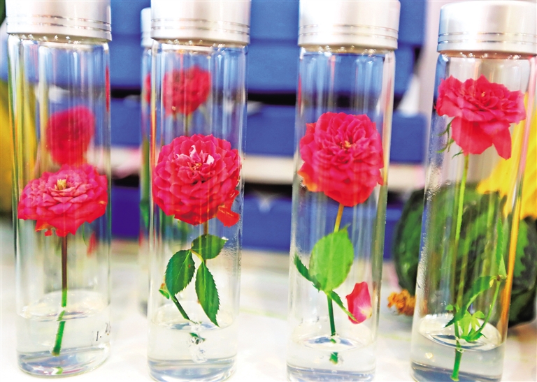在文昌馆内,航天展柜十分吸睛。其中,一款仅正常人拇指大小的航天月季花让不少爱美的女性游客分外喜欢。