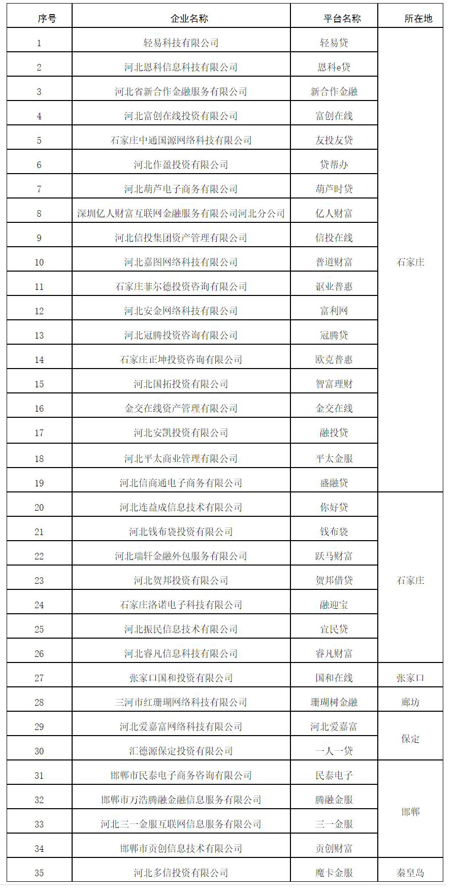 《公告》称,按照国家关于网络借贷风险专项整治工作部署,河北省在对区域内开展P2P网贷业务的机构进行“机构自查”、“自律检查”的基础上,各地又对提出申请的35家机构(名单附后)进行了“行政核查”。全省未有一家开展P2P网贷业务的机构完全符合“一个办法三个指引”有关规定。对行政核查不完全合规以及未纳入行政核查的所有开展P2P网贷业务的机构均属违规经营,全部依法依规予以取缔。
