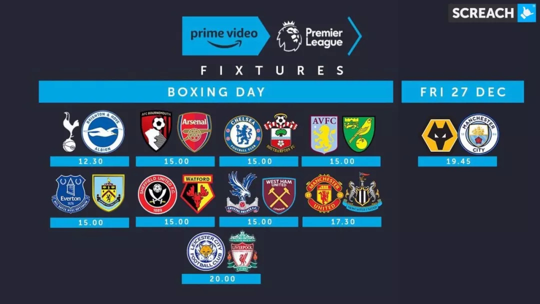 Prime Video平台节礼日英超转播预告