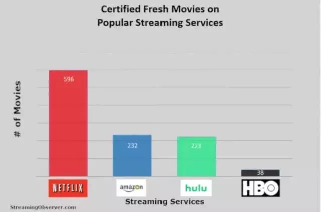 然而就影视作品质量而言,Netflix仍处于领先地位。较之Netflix拥有高达592部在烂番茄获得高认可的电影,Prime Video仅有232部,而Hulu更是仅有可怜的9部。Netflix影库中有16%的电影受到评论家广泛好评,而亚马逊则只有1.3%。