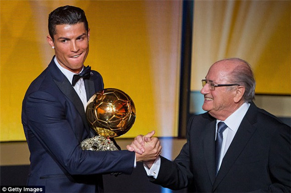 C罗领取2014年的金球奖时与当时的FIFA主席布拉特握手。(图片来源:网络)