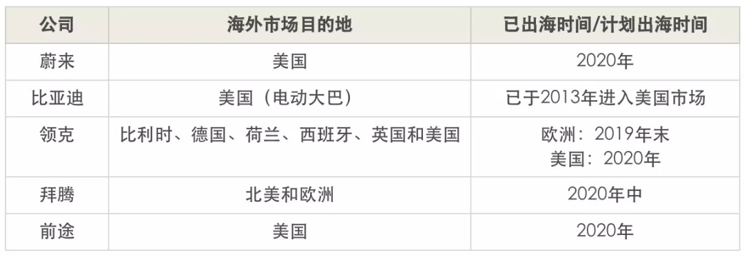 比亚迪之外,其他众多车企也发布了自己的出海规划时间表。其中蔚来、开运、领克、拜腾、前途均宣称会在最近一年进入美国市场。2018年,时任蔚来CFO的谢东萤表示蔚来汽车将在2020年在美国出售。