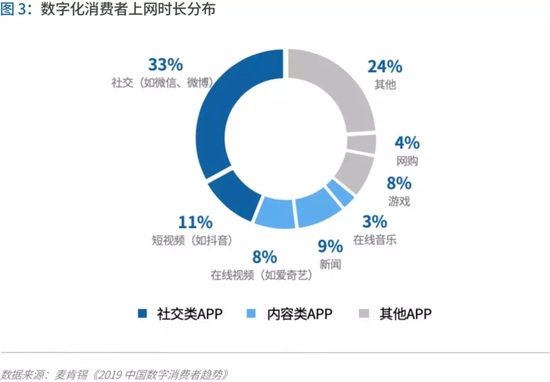 数字化时代,消费者不再区分线上线下,而是全渠道实时在线,电商渗透率已不足以反映消费者的数字化程度。此外,社交媒体、短视频平台、内容资讯平台等新流量入口占据消费者大部分在线时长,在“认知-兴趣-购买-忠诚”的购物旅程上,影响消费者决策的触点更加分散化。根据麦肯锡《2019中国数字消费者趋势》报告,中国数字消费者每人日均上网时长已达到358分钟,其中社交及内容占上网总时长的2/3,纯网购的上网时长只占到4%。